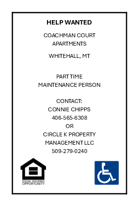 HELP WANTED: Coachman Court Apartments in Whitehall, MT is hiring for a part-time maintenance person. Contact Connie Chipps at 406-565-5308 or Circl K Property Managament, LLC at 509-279-0240.